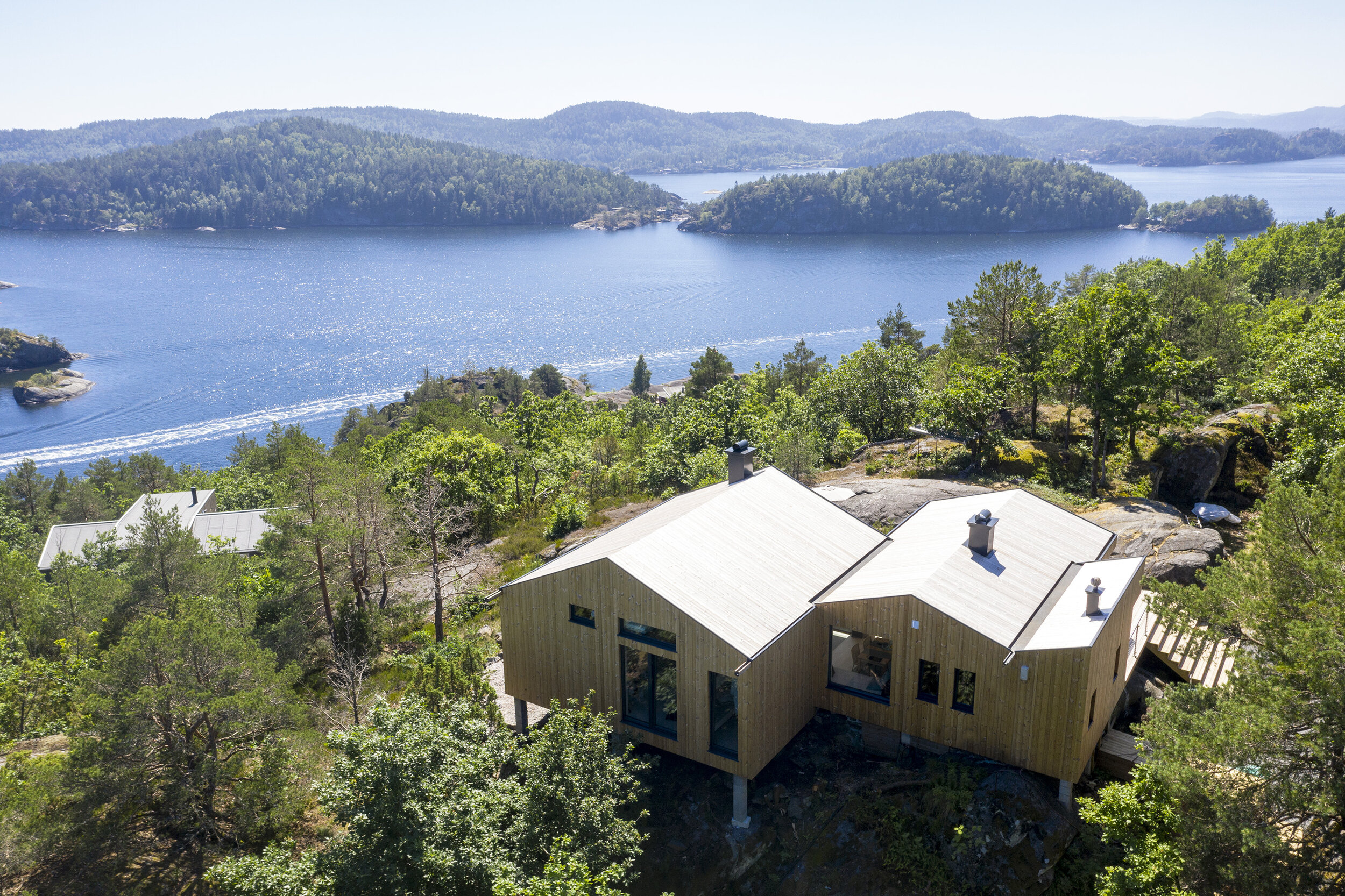 Yttervegger og tak er kledd i varmebehandla furu som vil gråne over tid, og føre til at bygget gradvis tilpasser seg det omkringliggende landskapet.